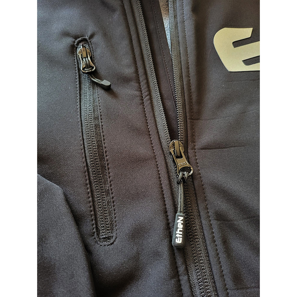 Due tasche laterali con zip, una taschino sul petto con zip, tirazip in plastica con gommino logo Ethen, polsini regolabili con velcro, interno in micropile.