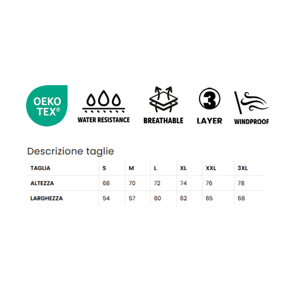 Caratteristiche tecniche: impermeabilità 8000 mm, traspirabilità 1000 gsm/h.