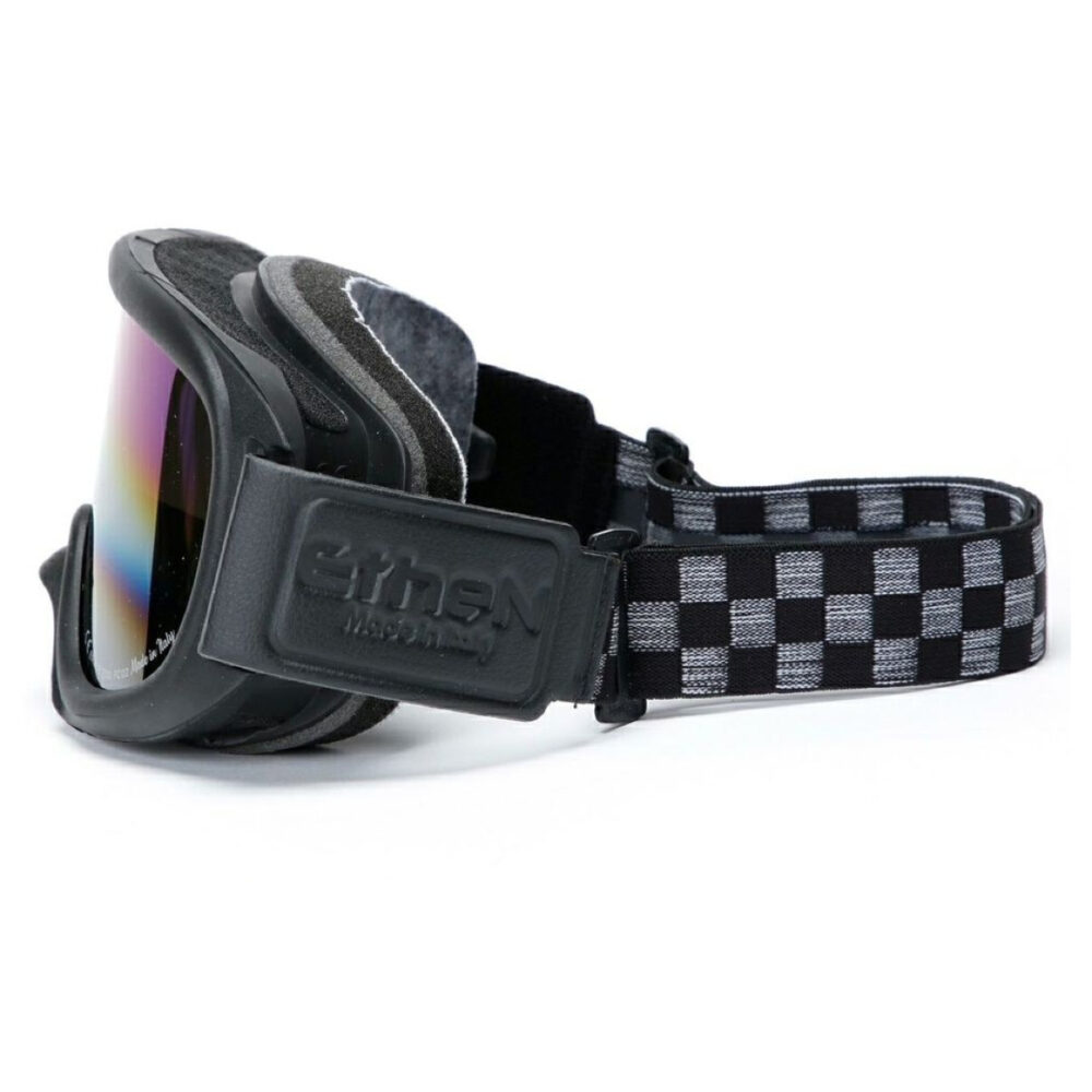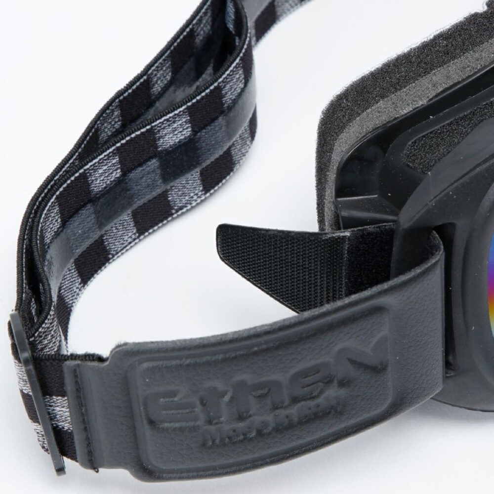 Il frame con paranaso integrato e il sistema OTG per gli occhiali da vista sono progettati per chi pretende il massimo comfort. La banda elastica siliconata, rifinita in similpelle con logo Ethen e completamente sostituibile, eleva lo stile e la funzionalità. È proprio questa attenzione al dettaglio che rende unica la nostra maschera da moto stile vintage modello bobber.