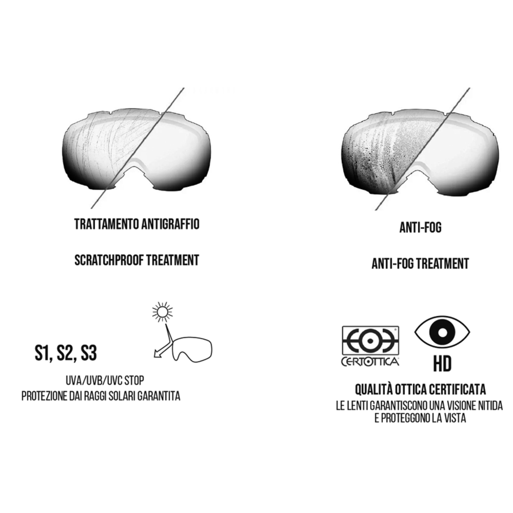 La lente doppio strato in policarbonato con antifog e filtri UVA-UVB-UVC garantisce protezione totale e visione nitida, mentre le specchiature di tendenza aggiungono un tocco di stile. La MASCHERA DA SCI MODELLO JUNIOR è dotata di fascia elastica con tripla siliconatura per un’aderenza ottimale sul casco e lente facile da sostituire.