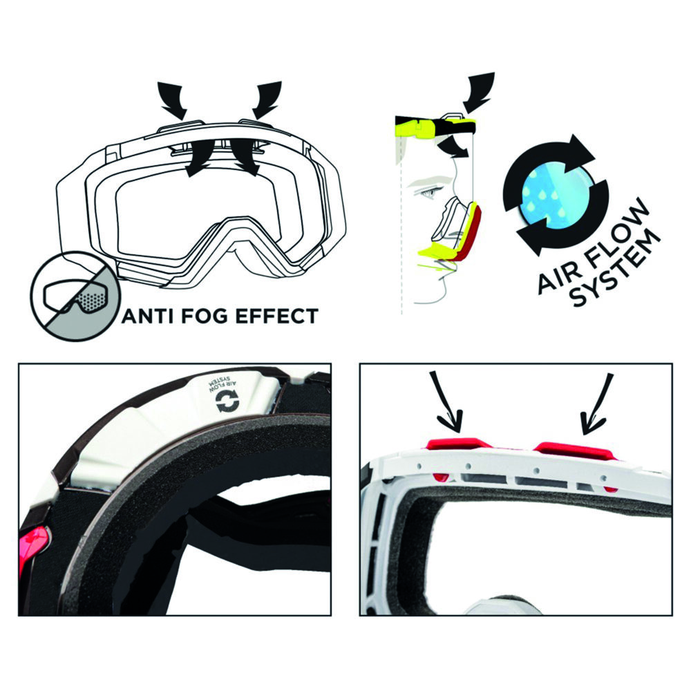 La banda elastica siliconata garantisce stabilità anche nelle situazioni più estreme, mentre il sistema di cambio lente veloce rende ogni adattamento immediato. L’innovativo AIR FLOW SYSTEM ottimizza la canalizzazione dell’aria, eliminando il rischio di appannamento. La spugna interna ad alto spessore e assorbenza incrementa il comfort anche durante utilizzi prolungati.